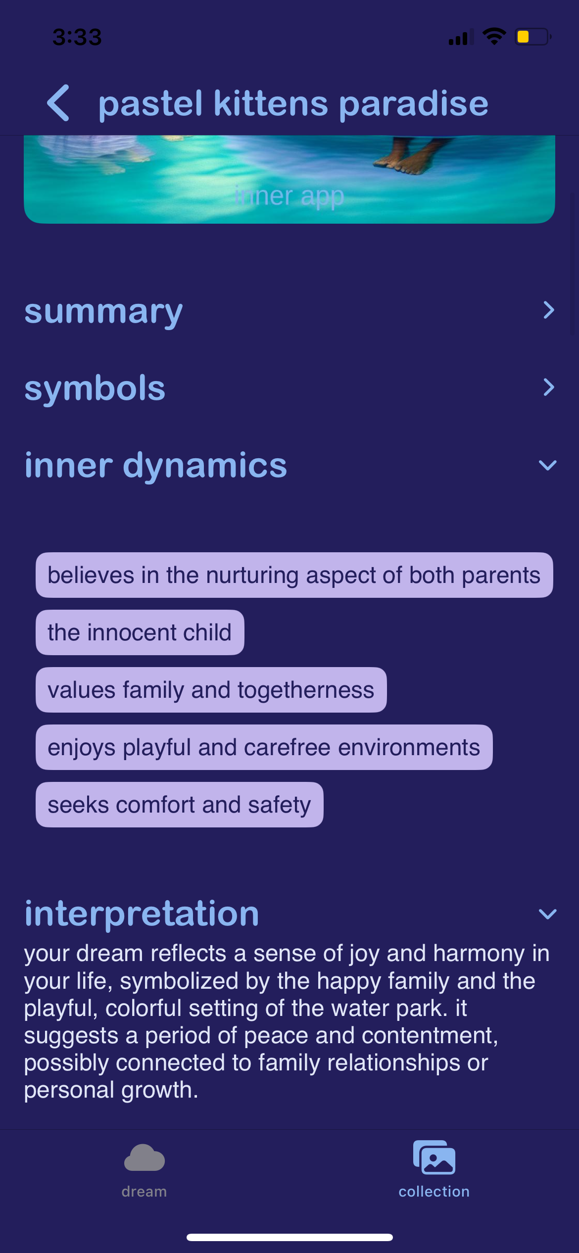 This is the ‘collection’ page from the ‘inner dream app’ summarizing one dream.